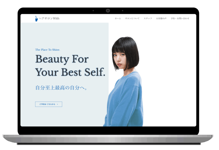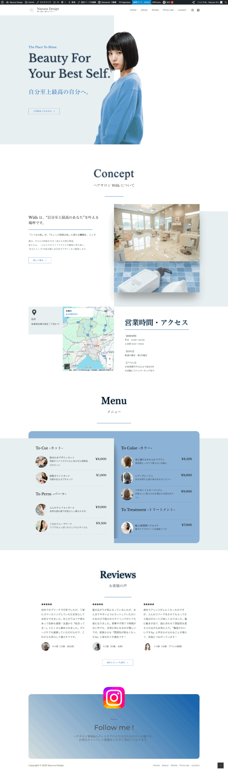 ヘアサロンWith ホームページ 実物プレビューはこちらから ▶︎ 概要 架空の美容室『ヘアサロンWith』のホームページです。(トップページのみ)美意識を高めたい女性に届くシンプルかつ洗練されたデザインにしました。 制作の目的 サロンのブランディング強化のため。インスタグラムだけでは流れてしまう情報を見やすく、ストレスなくお客様に届けるため。 ターゲット 20代後半〜40代の女性。 デザイン 「できるだけシンプルに、洗練されたイメージで」という要望があったと仮定し制作しました。洗練されたイメージを持たせるために、ブラックの明朝体にブルーの光彩を配色し、テキストは短いながらも伝えたい思いが伝わるように添削、作成しました。コンテンツごとの具切りがわかりやすく、見る人を惑わせないデザインです。予約ボタンをファーストビューに配置し、動線をスムーズになるようにしました。